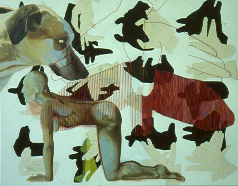 144 x 187 cm, 2003. Embroidery, gloss blackboard- and oil paint on canvas.